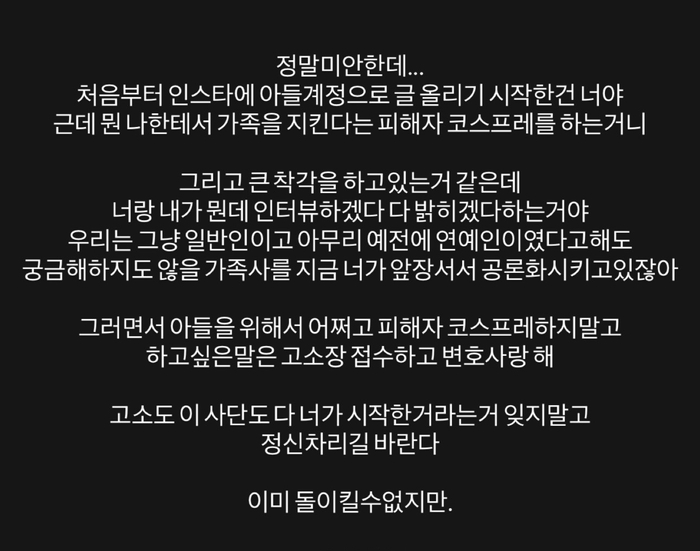동호는 이러한 A씨의 주장에 대해 아들 계정을 이용한 여론 몰이라며 “이미 돌이킬 수 없다”는 표현으로 타협 없는 진흙탕 싸움을 예고한 상태다.