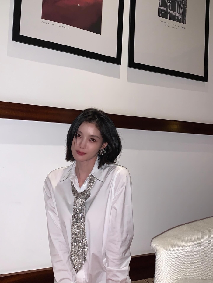어깨 라인이 강조된 화이트 재킷을 어깨에 살짝 걸친 모습은 도시적이고 세련된 분위기를 자아냈다. 특히 짧게 자른 단발머리는 김유정의 이목구비를 더욱 돋보이게 했다. 행사장 소파에 앉아 와인잔을 든 채 어딘가를 응시하는 모습은 마치 영화의 한 장면 같은 분위기를 풍겼다.
