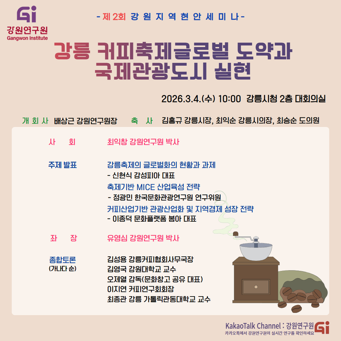 [스포츠서울ㅣ춘천=김기원기자]강원연구원(원장 배상근)은 3월 4일 (수) 10:00 강릉시청 2층 대회의실에서 『강릉 커피축제 글로벌 도약과 국제관광도시 실현』강원지역현안세미나를 개최한다.