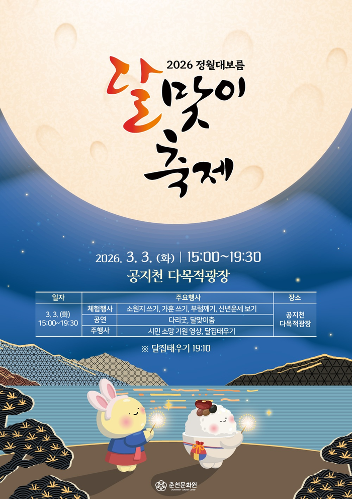 춘천문화원은 3일 오후 3시부터 7시 30분까지 공지천 다목적광장에서 ‘2026년 정월대보름 달맞이 축제’를 연다.
