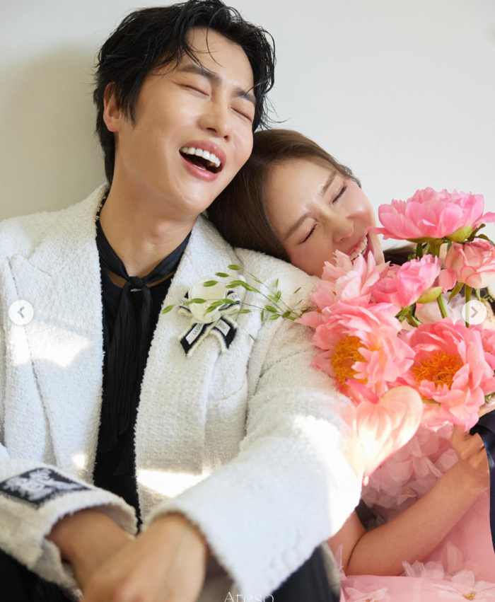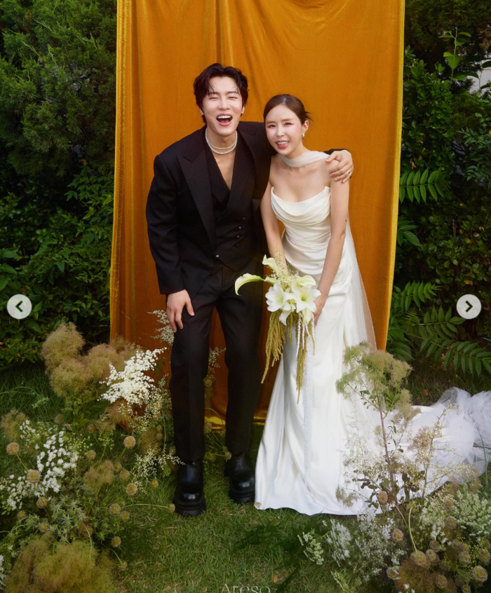 공개된 화보 속 신지는 순백의 튜브톱 웨딩드레스를 입고 우아하면서도 청순한 매력을 발산하고 있다. 특히 예비 신랑 문원과 함께 활짝 웃으며 손을 잡고 있는 모습에서는 예비부부의 설렘과 단단한 신뢰가 느껴진다.