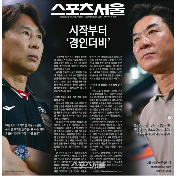 서울은 앞서 아시아 챔피언스리그 엘리트(ACLE) 2경기와 홍콩 구정컵 친선전까지 세 차례 실전 경기를 치렀다. 다만 2무1패(승부차기 패배는 무승부 기록)로 이기지 못했다. 인천전 승리가 어느 때보다 간절하다. 인천은 2년 만에 돌아온 1부 무대 첫판을 안방에서 치르는 만큼 자존심을 걸고 싸운다.