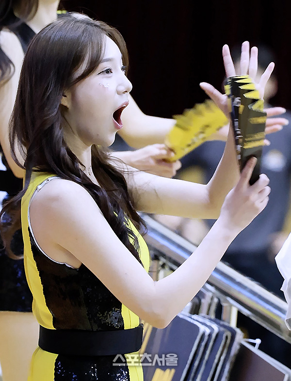 ‘진에어 2025~2026 V리그’ KB손해보험과 삼성화재의 경기에서 KB손해보험 치어리더 김현영이 나경복의 서브 에이스에 관중들과 함께 기쁜 함성을 터트리고 있다.