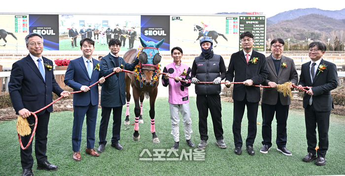 로쉬가 1일 한국마사회 렛츠런파크 서울에서 열린 ‘제39회 스포츠서울배 대상경마’(7경주·국산 3세·1400M·총상금 2억원)에서 우승을 차지했다. 한국마사회 송대영 경마본부장, 박재용 마주, 성상현 조교사, 장추열 기수, 말관리사, 스포츠서울 염진근 전무, 김종철 부장, 한국마사회 유병욱 홍보실장(왼쪽부터)이 기념촬영을 하고 있다.