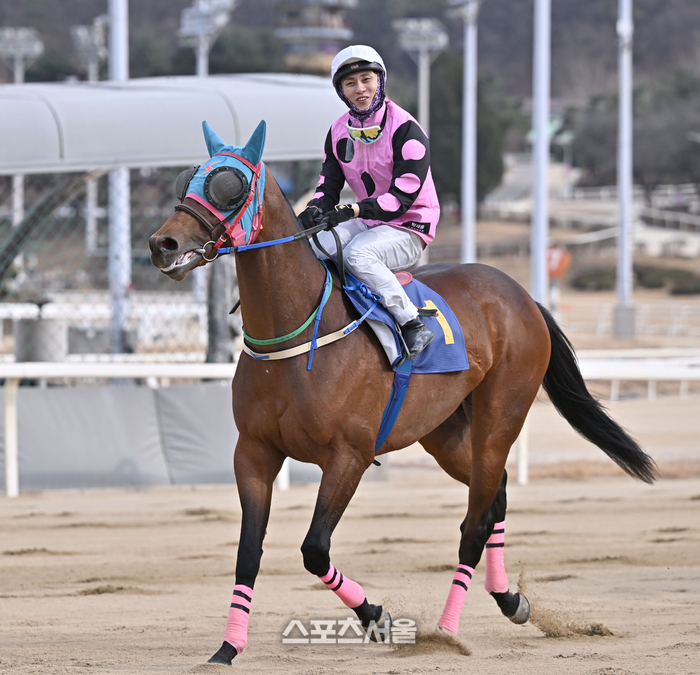 로쉬 장추열 기수가 1일 한국마사회 렛츠런파크 서울에서 열린 ‘제39회 스포츠서울배 대상경마’(7경주·국산 3세·1400M·총상금 2억원)에서 우승을 차지한 후 환하게 웃고 있다.