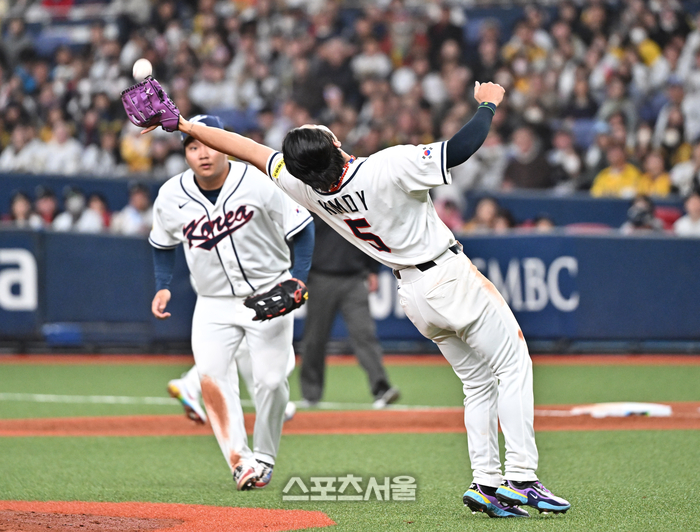 WBC 대한민국 야구대표팀의 3루수 김도영이 2일 일본 오사카 교세라돔에서 열린 한신 타이거즈와의 연습경기 3회말 한신의 캠 드베이니의 내야 뜬공을 넘어지며 잡아내고 있다. 2026. 3. 2.