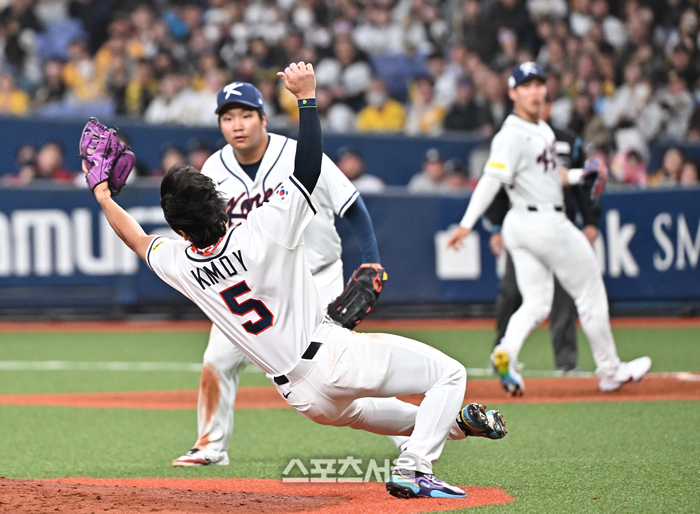 WBC 대한민국 야구대표팀의 3루수 김도영(가운데)이 2일 일본 오사카 교세라돔에서 열린 한신 타이거즈와의 연습경기 3회말 한신의 캠 드베이니의 내야 뜬공을 넘어지며 잡아내고 있다. 2026. 3. 2.