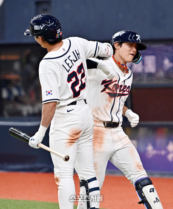 WBC 대한민국 야구대표팀의 김도영(오른쪽)이 2일 일본 오사카 교세라돔에서 열린 한신 타이거즈와의 연습경기 5회초 1사 한신 투수 하야가와를 상대로 동점 솔로 홈런을 친 뒤 이정후와 하이파이브를 하고 있다. 2026. 3. 2.