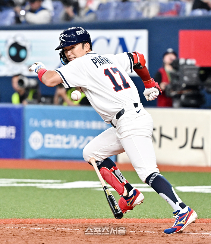 WBC 대한민국 야구대표팀의 박해민이 2일 일본 오사카 교세라돔에서 열린 한신 타이거즈와의 연습경기 9회초 무사 1루 상황에서 번트 안타를 치고 있다. 2026. 3. 2.
