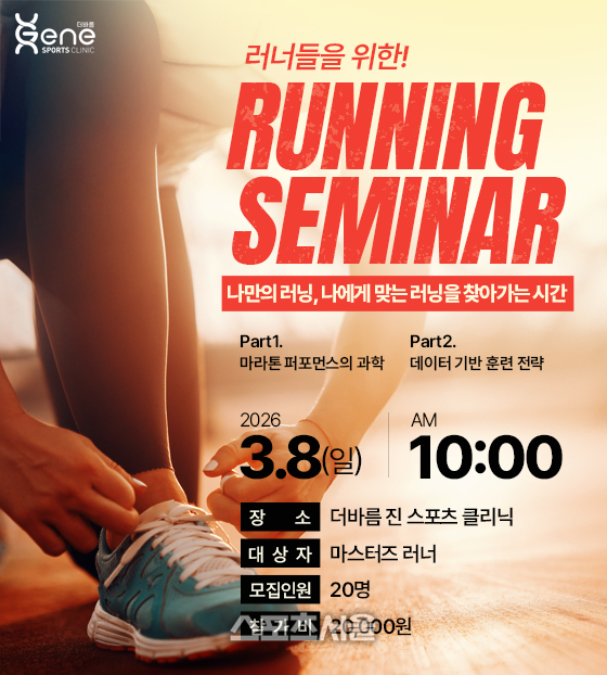 [스포츠서울 | 백승관 기자] ‘더바름정형외과(원장 이성락)’에서 운영하는 ‘더바름진스포츠클리닉’이 ‘마스터즈 러너들을 위한 러닝세미나’를 오는 3월 8일(일) 오전 10시 자양동에 위치한 ‘더바름진스포츠클리닉’에서 2시간 동안 진행한다.