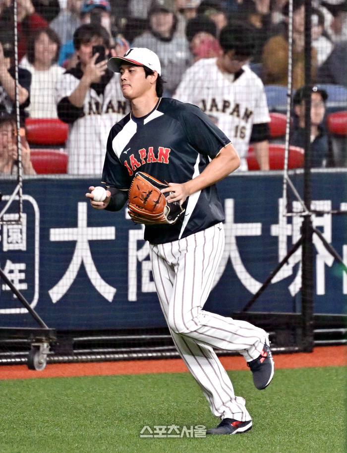 WBC 일본 야구대표팀의 오타니 쇼헤이가 2일 일본 오사카 교세라돔에서 진행된 오릭스 버팔로스와의 연습경기에 앞서 캐치볼로 몸을 푼 뒤 더그아웃으로 들어가고 있다. 2026. 3. 2.
