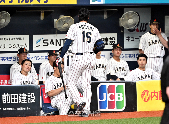 WBC 일본 야구대표팀의 오타니 쇼헤이가 2일 일본 오사카 교세라돔에서 진행된 오릭스 버팔로스와의 연습경기 4회초 타석에서 삼진 아웃으로 물러난 뒤 더그아웃으로 들어가고 있다. 2026. 3. 2.