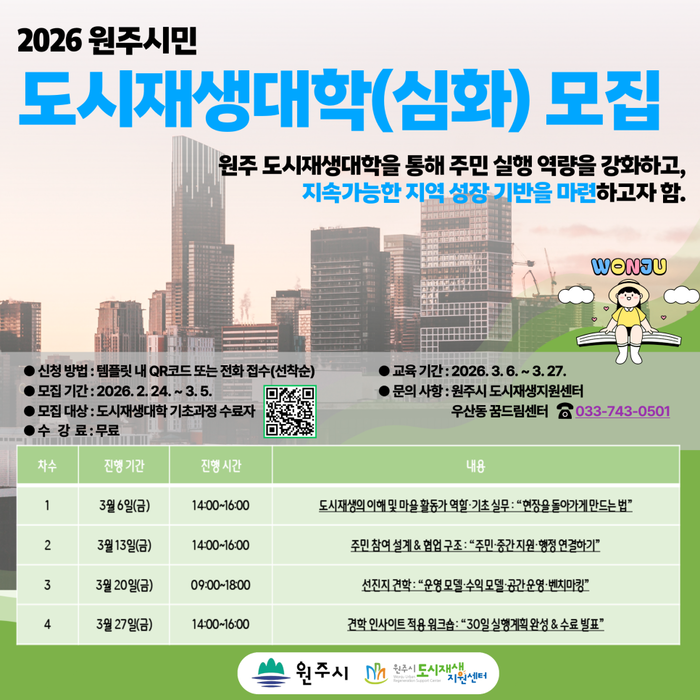 [스포츠서울ㅣ원주=김기원기자]원주시 도시재생지원센터(센터장 정철)는 오는 6일부터 27일까지 우산동 꿈드림센터에서 ‘2026년 원주시민 도시재생대학(심화)’를 매주 금요일 총 4회 과정으로 운영한다.