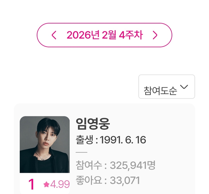2일 아이돌차트에 따르면 2월 4주차(2월 23일부터 3월 1일까지) 평점랭킹 집계에서 임영웅은 32만5941표를 받아 최다 득표를 기록했다. 이로써 임영웅은 257주 연속 1위에 이름을 올렸다.