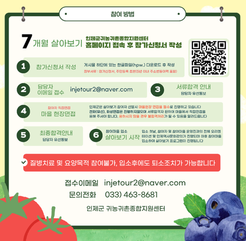 인제군 귀농귀촌종합지원센터는 오는 3월 19일까지 도시민을 대상으로 ‘2026년 귀농형 살아보기’ 참여자를 모집한다고 밝혔다.