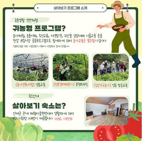 군은 참가자들이 지역 사회의 일원으로 자연스럽게 녹아들 수 있도록 지역 이해 교육과 선배 귀농인과의 네트워킹, 농촌 생활 적응 프로그램도 병행한다.