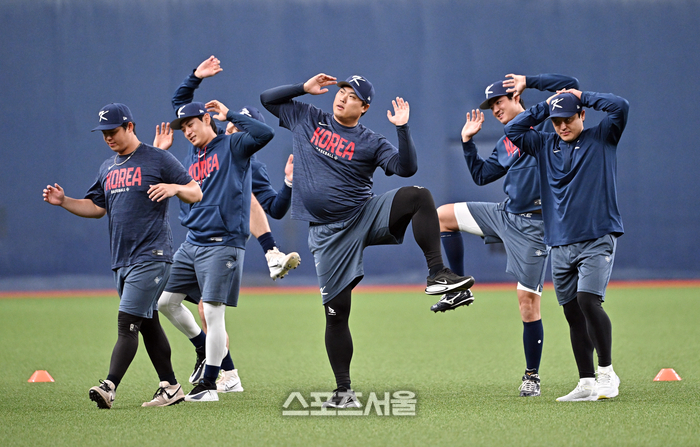 WBC 대한민국 야구대표팀이 3일 일본 오사카 교세라돔에서 열리는 오릭스 버팔로스와의 연습경기에 앞서 몸을 풀고 있다. 왼쪽부터 노시환, 이정후, 류현진, 구자욱, 박동원. 2026. 3. 3.