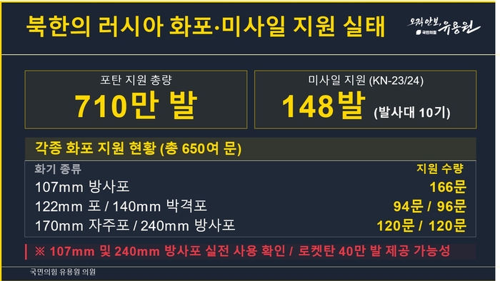 북한군의 무기 지원 규모 또한 상당한 수준이다. 유 의원은 지금까지 약 710만 발에 달하는 포탄과 KN-23, KN-24 탄도미사일 148발 등이 러시아에 제공된 것으로 추정된다고 밝혔다. 특히 북한군 107mm 및 240mm 방사포는 이미 실전에서 사용되었던 것으로 확인했으며, 40만 발의 로켓탄 추가 제공 가능성도 제기했다. 그 외 107mm 방사포 166문, 122mm 포 94문, 140mm 박격포 96문, 170mm 자주포 120문, 240mm 방사포 120문도 제공된 것으로 확인됐다.