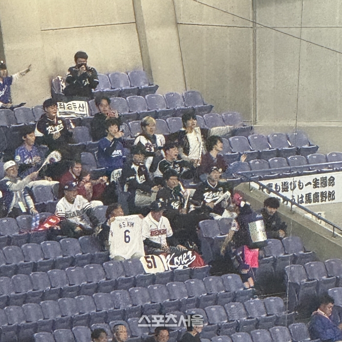 [스포츠서울 | 오사카=박연준 기자] 앰프도, 치어리더도 없었지만 그들의 목소리는 교세라돔의 높은 천장을 찌르기에 충분했다. 단 20여 명의 ‘소수정예’ 한국 팬들이 보여준 기막힌 육성 응원이 대단하게 느껴진다.