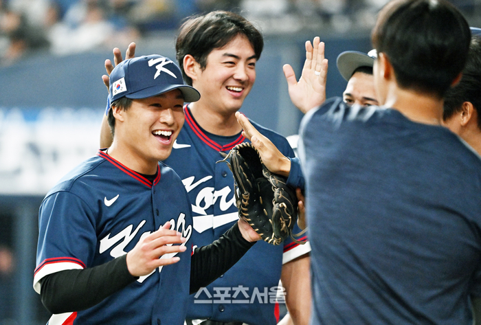 일본인 투수 고바야시 키토가 3일 일본 오사카 교세라돔에서 열린 대한민국 야구대표팀과 오릭스 버팔로스의 연습경기 8회말 대한민국 대표팀으로 등판해 추가 실점 없이 이닝을 끝낸 뒤 구자욱 등 한국 선수들의 축하를 받고 있다. 2026. 3. 3.