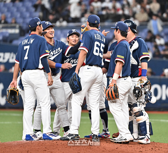 WBC 대한민국 야구 대표팀이 3일 일본 오사카 교세라돔에서 열린 대한민국 야구대표팀과 오릭스 버팔로스의 연습경기에서 승리한 뒤 하이파이브를 나누고 있다. 2026. 3. 3.