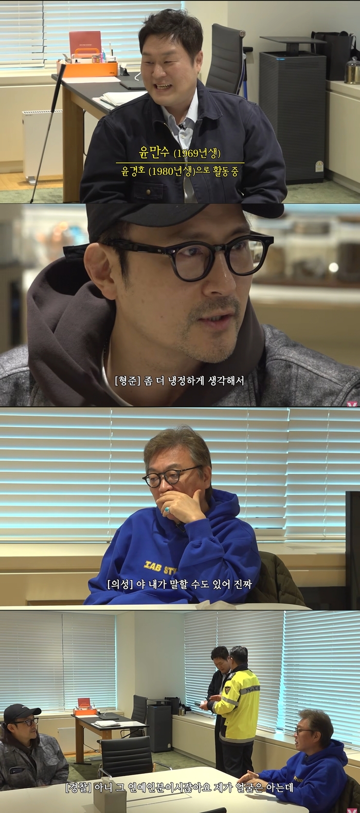 분위기를 뒤흔든 건 뜻밖의 상황이었다. 주차 민원으로 출동한 경찰이 신분증 확인을 요청했고, 그 과정에서 윤경호가 ‘69년생 윤만수’라는 사실이 공개돼 충격을 안겼다. 그간 노안 이미지를 내세워왔던 윤경호는 결국 캐스팅 전략의 일환이었다고 털어놓았고 충격에 빠진 김의성과 임형준에게 고급 시계를 건네는가 하면 “앞으로 제 개런티의 5%는 임형준, 8%는 김의성에게 주겠다”라는 파격 제안으로 입막음을 시도했다.