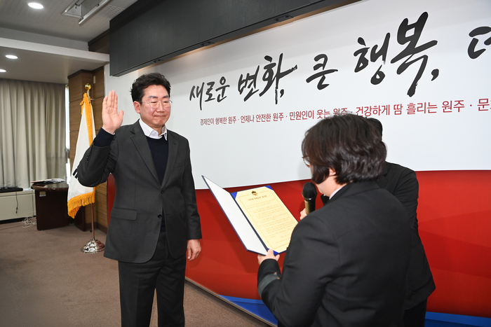 [스포츠서울ㅣ원주=김기원기자]원주시는 지난 3일 시청 대회의실에서 원강수 시장과 간부공무원 등 120여 명이 참석한 가운데 ‘2026년 간부공무원 청렴실천 결의대회’를 개최했다.