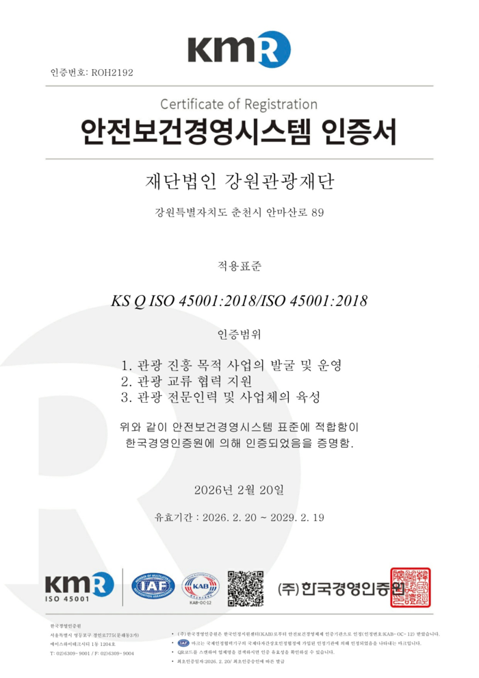 [스포츠서울ㅣ춘천=김기원 기자]재단법인 강원관광재단(대표이사 최성현, 이하‘재단’)이 국제표준화기구(ISO)가 제정한 안전보건경영시스템(ISO 45001) 인증을 한국경영인증원(KMR)으로부터 지난 2월 20일 (금), 획득했다고 밝혔다.