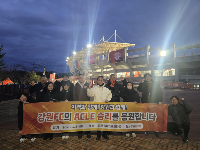 [스포츠서울ㅣ춘천=김기원 기자]강원연구원(원장 배상근)은 3월 3일(화) 강원특별자치도 춘천시 송암스포츠타운에서 열린 ‘2025-2026 AFC 챔피언스리그 엘리트(ACLE)’ 16강 경기를 단체 관람하며 도내 프로축구단 강원FC의 좋은 활약을 응원했다.