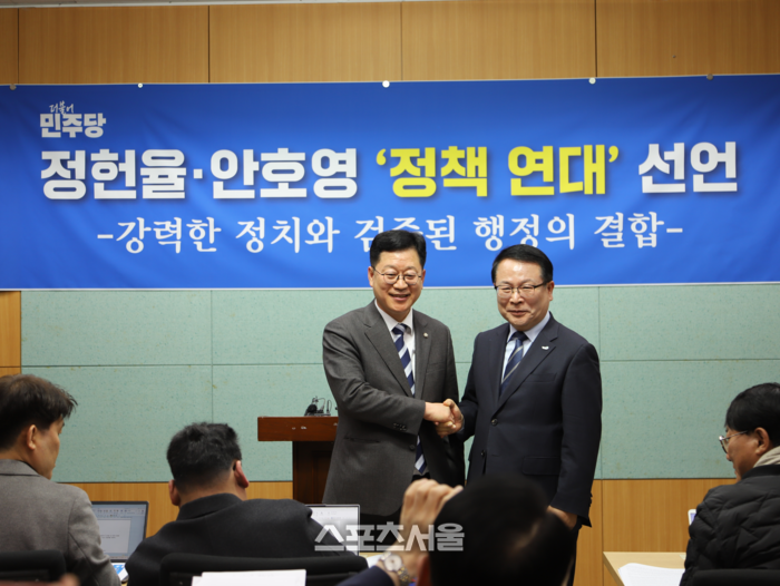 [스포츠서울 ㅣ 전주=고봉석 기자] 전북지사 선거에 나선 안호영 의원과 정헌율 익산시장이 3일 전북도의회 브리핑룸에서 기자회견을 열고 “안호영의원으로의 정책연대를 하기로 했다”고 밝혔다.