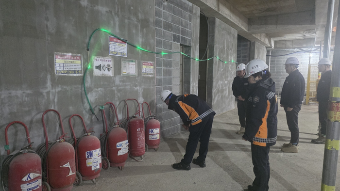 주요 확인 내용은 ▲ 공사 공적율▲ 임시 위험물 옥외저장소 유지관리 ▲ 소화기 등 임시 소방시설 유지관리 ▲ 공사장내 피난안내도 설치 및 유지 등을 확인했다.