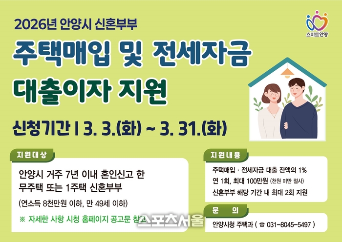 〔스포츠서울│안양=좌승훈기자〕경기 안양시는 ‘신혼부부 주택매입 및 전세자금 대출이자 지원사업’을 시행한다고 4일 밝혔다.