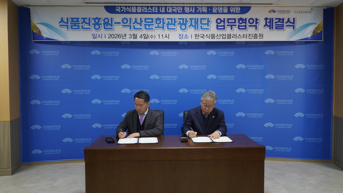 [스포츠서울ㅣ김기원 기자]한국식품산업클러스터진흥원(이사장 김덕호, 이하 식품진흥원)은 3월 4일 식품진흥원 본관 대회의실에서 익산문화관광재단(대표이사 김세만)과 국가식품클러스터 내 대국민 행사 기획·운영을 위한 업무협약(MOU)을 체결했다고 밝혔다. 이번 협약은 국가식품클러스터의 역할과 위상을 널리 알리고, 스포츠관광과 연계한 산업관광 콘텐츠를 공동으로 발굴하기 위해 추진됐다.