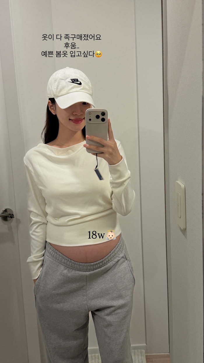사진 속 김지영은 흰색 볼캡을 쓴 채 임신 18주 차의 ‘D라인’을 거울 셀카로 담았다.