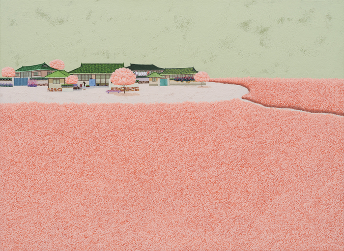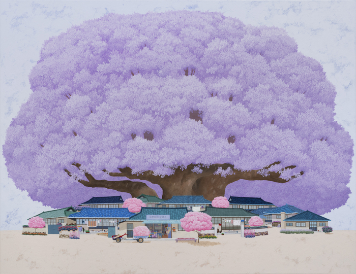 ‘미선이네 동네’에서는 보랏빛 꽃구름 같은 나무가 화면을 가득 채운다. 분홍빛 나무와 푸른 기와가 어우러진 풍경은 봄날의 기억을 환기한다.