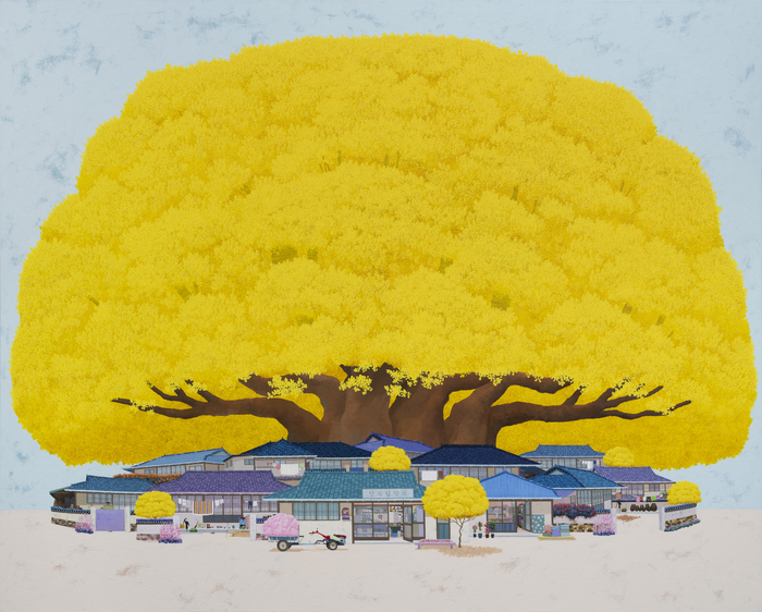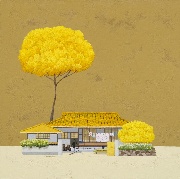 황금빛 배경과 지붕, 나무가 통일감을 이루며 기억은 더욱 농축된다. 장독, 빨래, 빗자루, 마당에 말린 곡물 같은 사소한 오브제는 삶의 시간을 조용히 증언한다.