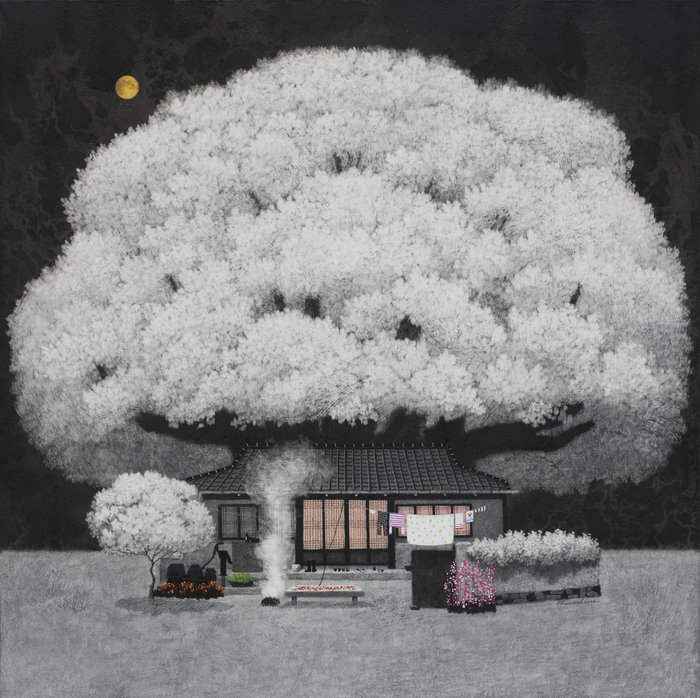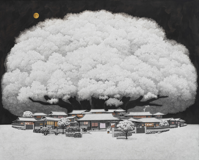 설밥처럼 흰 나무 아래 불이 켜진 창문, 달빛이 드리운 마당은 고요한 정서를 만든다. 어둠 속에서 오히려 집의 온기가 더 또렷해진다.