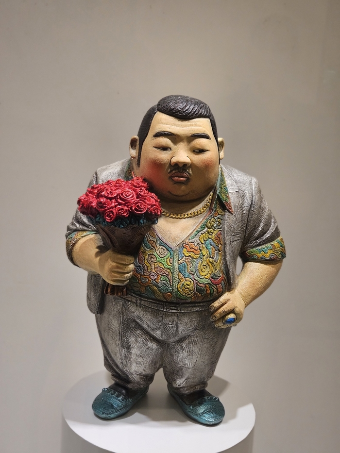양복 차림의 남성이 꽃다발을 들고 서 있는 작품은 첫눈에 익살스럽다. 불룩한 배, 짧은 팔다리, 살짝 삐딱한 시선. 그러나 시선을 오래 두면 묘한 순정이 읽힌다.
