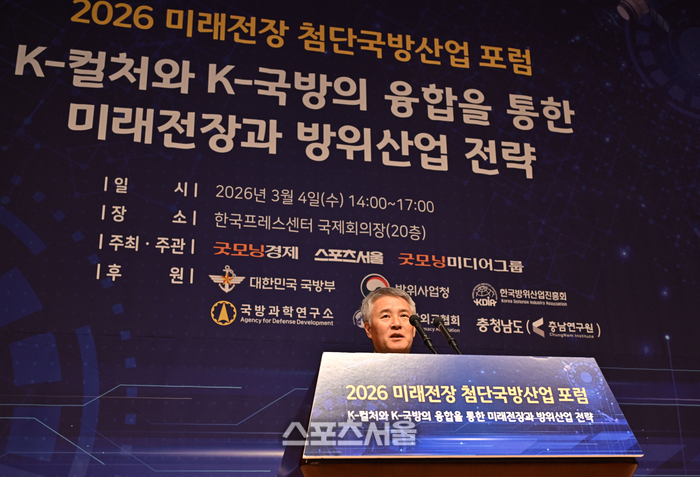 김상혁 굿모닝미디어그룹 회장이 4일 서울 중구 프레스센터에서 열린 ‘2026 미래전장 첨단국방산업 포럼’ 개회사를 하고 있다.
