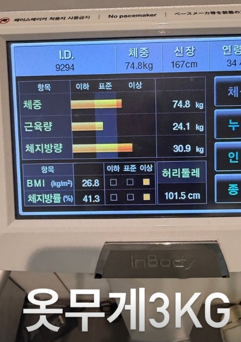체중계 화면을 공개하며 “옷 무게 3㎏”이라고 덧붙여 웃음을 자아낸다.