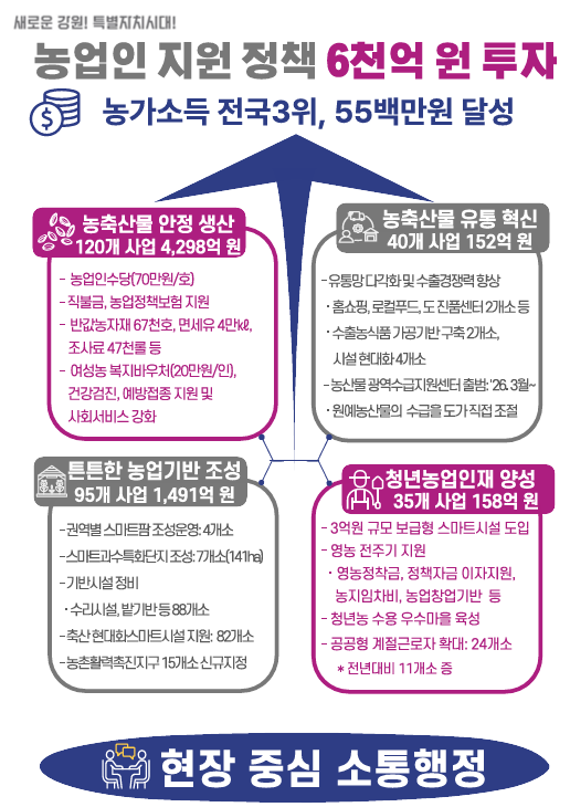 한편, 도는 2025년 농가소득 53백만 원으로 역대 최고치를 기록하며 4년 연속 전국 3위를 달성한 데 이어, 2026년에는 농가소득 55백만 원 달성과 농식품 수출 1조 4백억 원을 목표로 설정했다.