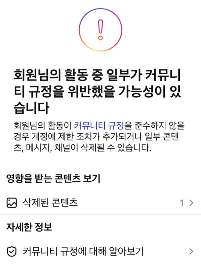 공개된 사진 속엔 “회원님의 활동 중 일부가 커뮤니티 규정을 위반했을 가능성이 있습니다”라는 문구와 함께 삭제된 콘텐츠가 1개 있다고 담겨 있다.