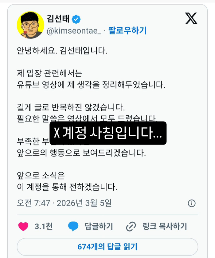 이에 김선태는 “X 계정 사칭입니다. 신고 부탁드립니다”라고 단호한 입장을 밝히며, 해당 계정이 자신과 무관함을 분명히 했다. 논란이 거세지자 해당 사칭 계정은 현재 삭제된 상태다.