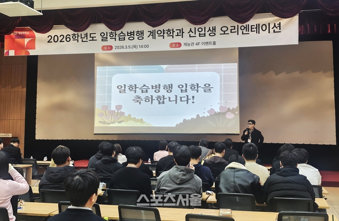 [스포츠서울 | 백승관 기자] 재능대학교(총장 이남식)는 지난 5일 재능관 4층 이벤트홀에서 ‘2026학년도 일학습병행 계약학과 입학식 및 오리엔테이션’을 개최하며 산업현장과 교육현장을 아우르는 실무형 인재 양성의 시작을 알렸다. 이날 행사에서 최덕주 일학습병행공동훈련센터장을 비롯한 교수진과 신입생 등 80여 명이 참석해 새로운 출발을 함께했다.