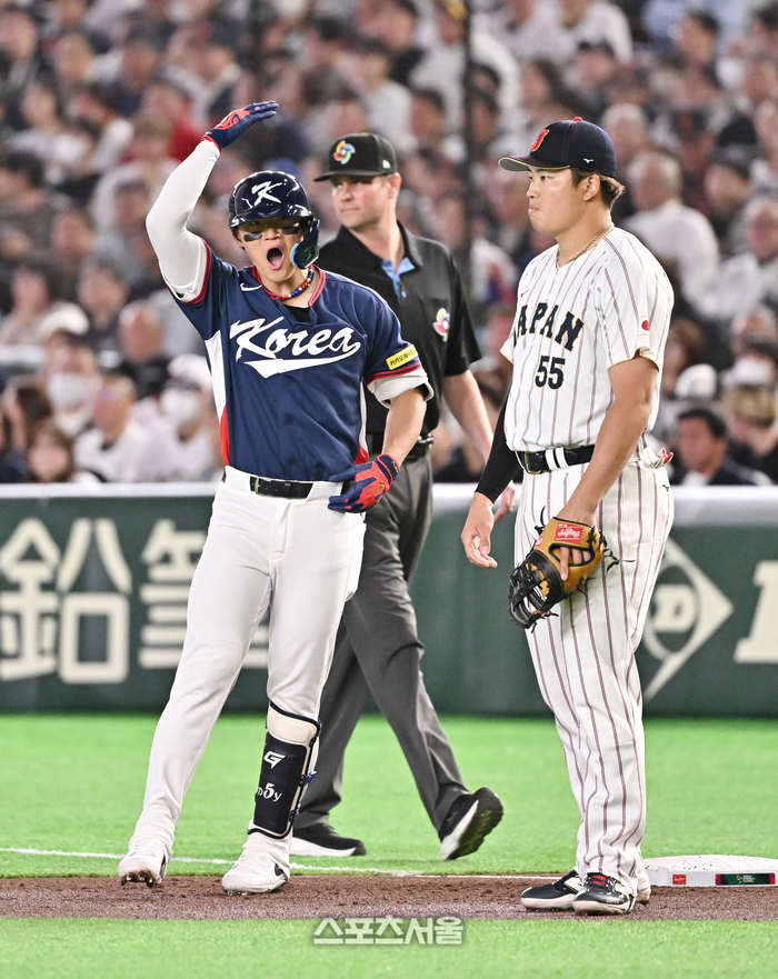 대한민국 야구대표팀의 김도영이 7일 일본 도쿄 도쿄돔에서 열린 2026 월드 베이스볼 클래식(WBC) 조별리그 일본과의 경기 1회초 무사 일본 선발 기쿠치를 상대로 안타를 친 뒤 세리머니를 하고 있다. 2026. 3. 7.