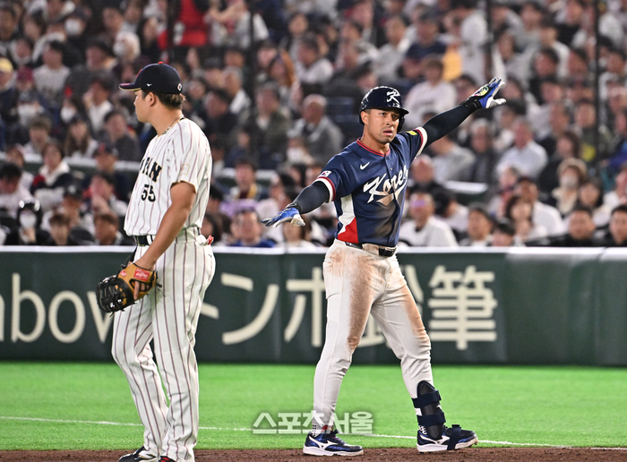 대한민국 야구대표팀의 저마이 존스가 7일 일본 도쿄 도쿄돔에서 열린 2026 월드 베이스볼 클래식(WBC) 조별리그 일본과의 경기 3회초 무사 안타를 친 뒤 세리머니를 하고 있다. 2026. 3. 7.