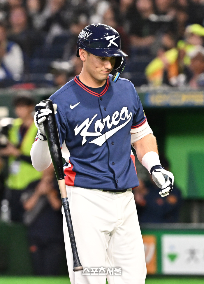 대한민국 야구대표팀의 셰이 위트컴이 7일 일본 도쿄 도쿄돔에서 열린 2026 월드 베이스볼 클래식(WBC) 조별리그 일본과의 경기 3회초 1사 1-2루 상황에서 삼진 아웃을 당한 뒤 더그아웃으로 들어가고 있다. 2026. 3. 7.