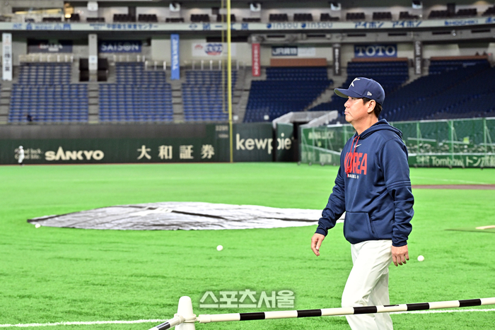 대한민국 야구대표팀의 류지현 감독이 8일 일본 도쿄 도쿄돔에서 열리는 2026 월드 베이스볼 클래식(WBC) 조별리그 대만과의 경기에 앞서 선수들이 훈련 중인 외야로 걸어가고 있다. 2026. 3. 8.