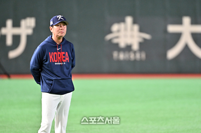 대한민국 야구대표팀의 류지현 감독이 8일 일본 도쿄 도쿄돔에서 열리는 2026 월드 베이스볼 클래식(WBC) 조별리그 대만과의 경기에 앞서 선수들의 훈련을 지켜보고 있다. 2026. 3. 8.