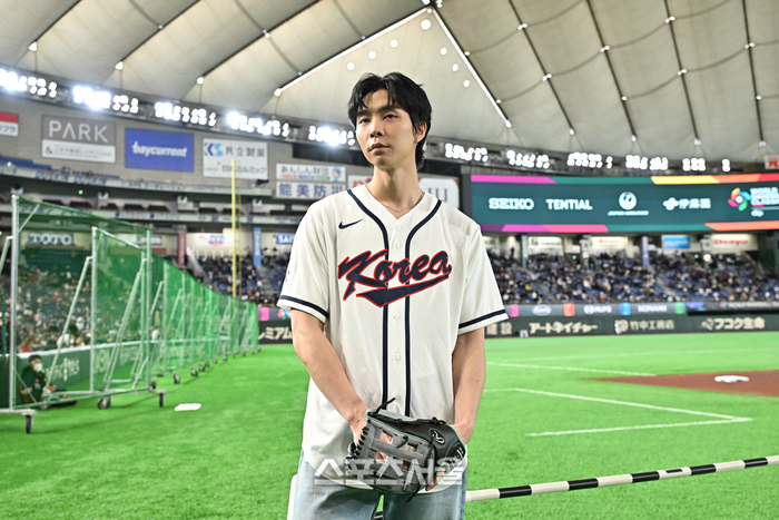 NCT 쟈니가 8일 일본 도쿄 도쿄돔에서 열리는 2026 월드 베이스볼 클래식(WBC) 조별리그 한국과 대만의 경기에 앞서 취재진을 향해 포즈를 취하고 있다. 쟈니는 경기의 시구를 맡았다. 2026. 3. 8.